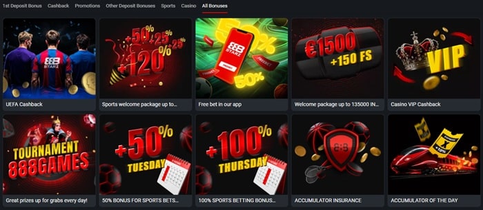 Every Thursday, 888Starz runs a special promotion: you make a deposit, and you receive a 100% bonus on that deposit. To redeem it, you must wager 5× the bonus amount in accumulator bets within 24 hours of receiving the bonus. Each accumulator must have three or more selections, and all selections should satisfy minimum odd conditions.