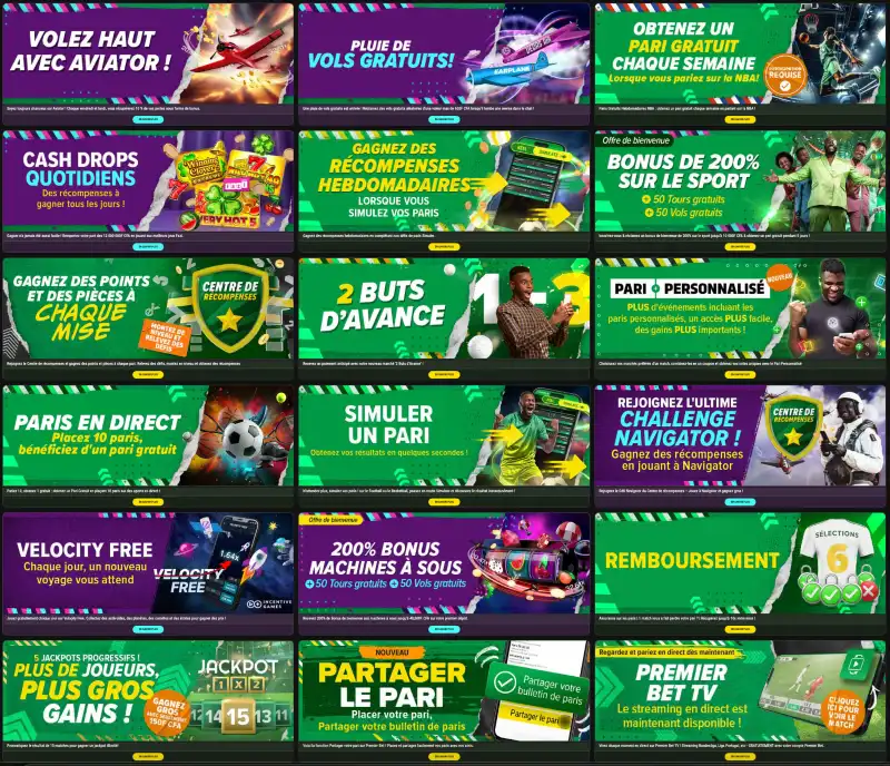 - Offres attractives : Premier Bet propose des bonus compétitifs, comme le bonus de bienvenue de 200% sur le 1er dépôt, jusqu'à 10000 CFA sur le sport et